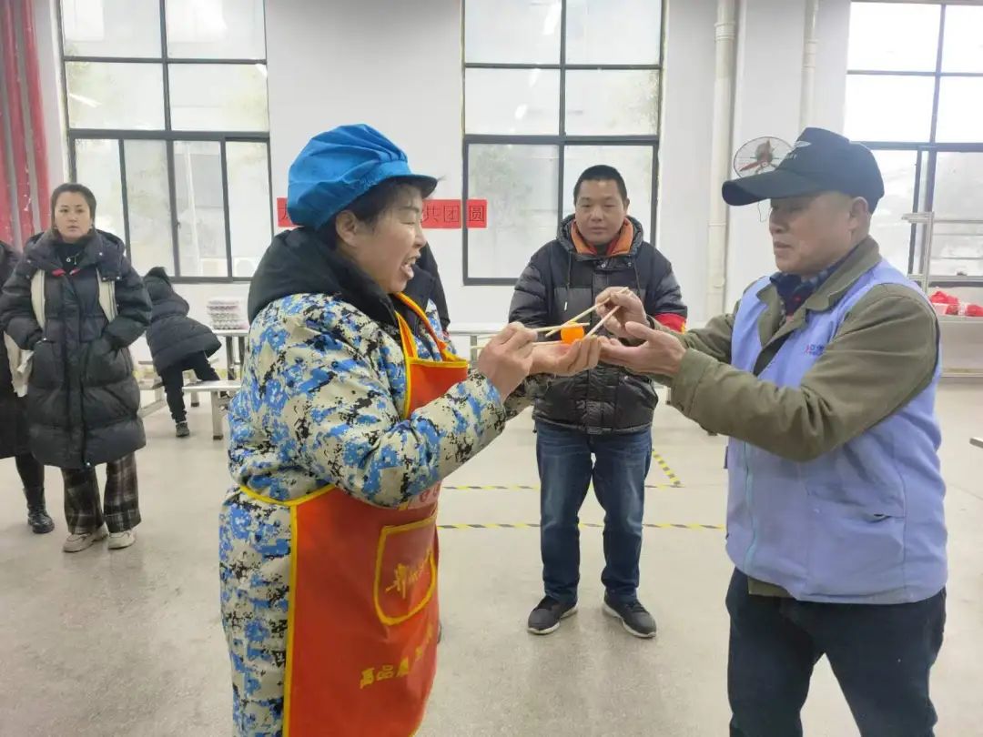除了包湯圓外,現(xiàn)場還設(shè)置了有趣的夾“湯圓”游戲。游戲規(guī)則簡單易懂:參賽者需用筷子在限定時間內(nèi)從盆中夾出湯圓并完成接力,夾得越多,得分越高。這個游戲不僅考驗了大家的技巧、耐心和團隊協(xié)作能力,更增添了活動的趣味性和互動性。員工們紛紛排隊參與,有的輕松應對,有的則笑得前仰后合,大家都沉浸在節(jié)日的歡樂氛圍中。