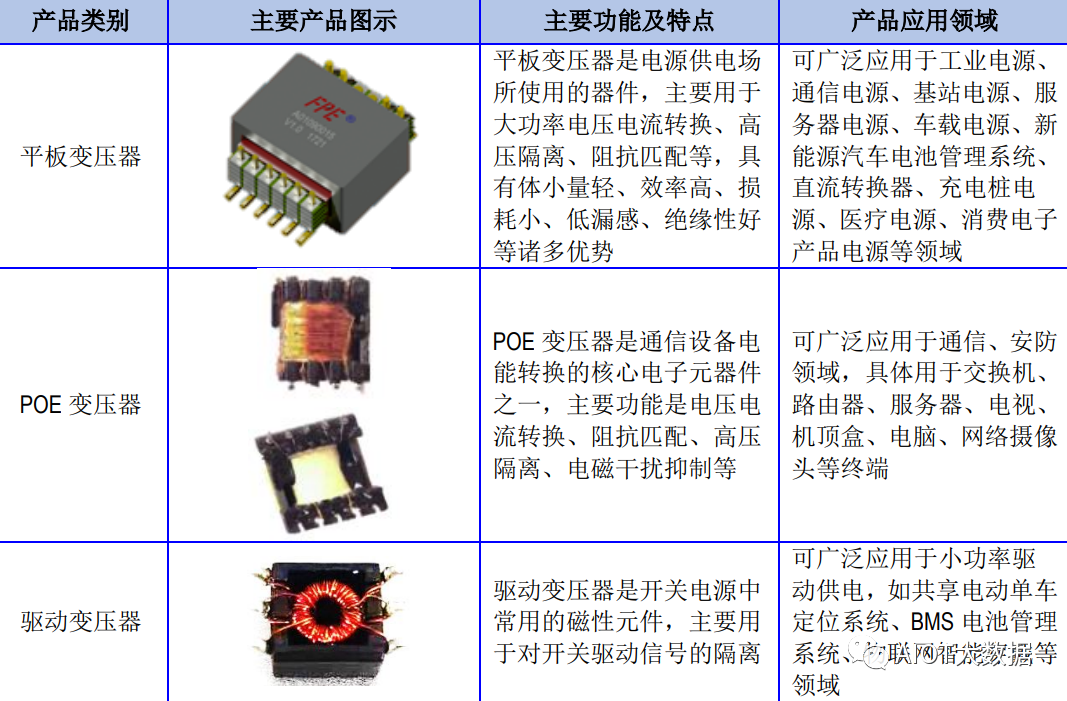 磁性元器件主要產品包括網(wǎng)絡變壓器、片式電感、功率磁性元器件,已廣泛用于網(wǎng)絡通信領域,并在新能源汽車、工業(yè)電源等領域。網(wǎng)絡變壓器是眾多網(wǎng)絡通信設備必需的基礎元器件之一,在通信設備中起著傳輸信號、隔離高壓、阻抗匹配、抑制電磁波干擾等作用。目前,公司網(wǎng)絡變壓器包括DIP(DualIn-linePackage,雙列直插封裝)、SMD(SurfaceMountDevices,表面貼裝器件)等子類。網(wǎng)絡變壓器的主要功能是傳輸信號、隔離高壓、阻抗匹配、抑制電磁波干擾等,是網(wǎng)絡通訊設備的核心電子元器件之一。網(wǎng)絡變壓器由塑膠外殼、磁芯、漆包線,通過特殊的繞制方法制成,其中由磁芯和漆包線組成基本的變壓器線圈,可廣泛應用于網(wǎng)絡通信領域,具體用于交換機、路由器、服務器、機頂盒、電腦、網(wǎng)絡電視、網(wǎng)絡攝像頭等設備。片式電感作為網(wǎng)絡通信、消費電子、安防設備、汽車電子等電子設備的基礎電子元件,是利用電磁電路設計技術,搭配精密自動化繞線技術生產的新型SMD磁性元器件,采用成熟的SMT技術發(fā)展出來的全自動化產品。片式電感符合電子產品“短小輕薄”的發(fā)展趨勢,網(wǎng)絡通信、消費電子、安防設備、汽車電子等產業(yè)的快速發(fā)展對片式電感的需求量將大幅增長。片式電感利用電磁電路設計技術,搭配精密自動化繞線技術生產的新型SMD磁性元器件,采用成熟的SMT技術發(fā)展出來的全自動化產品。主要用于篩選信號、過濾噪聲、穩(wěn)定電流及抑制電磁波干擾等??蓮V泛應用于網(wǎng)絡通信、消費電子、安防設備等領域,具體用于路由器、服務器、網(wǎng)絡攝像頭、平板電腦、網(wǎng)絡電視等設備。功率磁性元器件是電源裝置的基礎元器件之一,在電子電路中起著電壓變換、能量轉移、儲能濾波、隔離高壓或篩選信號、穩(wěn)定電流及抑制電磁波干擾的作用。磁性元器件是實現(xiàn)電能和磁能相互轉換的電子元器件,屬于電子元器件行業(yè)領域的重要分支,是保證電器電子設備穩(wěn)定工作的重要基礎元器件。磁性元器件應用領域非常廣泛,覆蓋了網(wǎng)絡通信、汽車電子、工業(yè)電源、消費電子、安防設備、智能家居、醫(yī)療電子等眾多領域。磁性元器件品類眾多,每種產品的型號和規(guī)格均存在一定差異。得益于應用領域的廣泛性,磁性元器件未來具有良好的市場發(fā)展空間。在網(wǎng)絡通信領域,磁性元器件主要應用于路由器、交換機、服務器、機頂盒、光纖收發(fā)器、網(wǎng)絡電視、終端通信設備等網(wǎng)絡通信產品;新能源汽車領域,新能源汽車配置電池、電機、電控等電子系統(tǒng),車載電子產品應用場景較傳統(tǒng)燃油車更加廣闊,新能源汽車電子磁性元器件使用率更高,同時新能源汽車充電樁也會涉及磁性元器件的應用;在工業(yè)電源領域,通信電源、服務器電源、電力電源、醫(yī)療電源等電源設備都需要磁性元器件;在消費電子領域,智能手機、平板電腦、筆記本電腦等消費電子產品的電源模塊、充電器都會涉及磁性元器件的應用。磁性元器件是電子設備的基礎元器件之一,在電子元器件產業(yè)中具有重要的地位,屬于電子設備制造產業(yè)鏈的上游,其市場需求及發(fā)展趨勢與下游應用領域的發(fā)展緊密相關。磁性元器件下游應用領域包括網(wǎng)絡通信、新能源汽車、工業(yè)電源、安防設備、消費電子等,下游產品需求的快速增長直接帶動了市場對磁性元器件的需求。全球網(wǎng)絡通信設備市場規(guī)模整體呈增長趨勢,而我國網(wǎng)絡通信設備市場增速更快。網(wǎng)絡通信設備是用于網(wǎng)絡連接、維持數(shù)據(jù)傳輸?shù)脑O備,屬于信息化建設所需的基礎架構產品,涵蓋路由器、交換機、服務器、機頂盒、5G基站等設備。網(wǎng)絡通信設備是磁性元器件應用的重點領域。在高質量網(wǎng)絡連接需求迫切、Wi-Fi6技術普及與應用、國家大力推行以5G和千兆光網(wǎng)為代表的“雙千兆網(wǎng)絡”的背景下,路由器設備將迎來新一輪迭代更新,路由器中實現(xiàn)網(wǎng)絡信號傳輸功能的核心組件就是網(wǎng)絡變壓器,路由器的更新?lián)Q代將極大增加對磁性元器件的市場需求,推動磁性元器件的發(fā)展與技術迭代升級。Wi-Fi6路由器升級改造成為必然發(fā)展趨勢,具體情況如下:第一,隨著網(wǎng)絡質量要求的不斷提高,以及物聯(lián)網(wǎng)、大數(shù)據(jù)等技術驅動聯(lián)網(wǎng)設備的持續(xù)增加,傳統(tǒng)Wi-Fi性能在面對新興應用場景下顯得捉襟見肘。第二,教育、醫(yī)療、制造、政府、金融等都在加快數(shù)字化轉型的步伐,遠程辦公、線上教育、視頻會議、智慧醫(yī)療等應用場景快速發(fā)展,使用網(wǎng)絡的終端設備數(shù)量持續(xù)攀升,迫切需要強大的網(wǎng)絡支撐達到數(shù)字通訊順暢的用戶體驗,也促使Wi-Fi6技術強勢發(fā)展,帶動了路由器產品的升級改造。第三,我國政府大力推動5G和千兆光網(wǎng)建設,推動移動寬帶和固定寬帶雙雙進入千兆時代。隨著千兆網(wǎng)絡的滲透,AP端口(AccessPoint)設備將升級替代,Wi-Fi6路由器能夠發(fā)揮千兆網(wǎng)絡的速度。我國網(wǎng)絡基礎設施建設提速,會帶來路由器大范圍的升級換代,從而大幅增加Wi-Fi6路由器的采購需求。根據(jù)IDC數(shù)