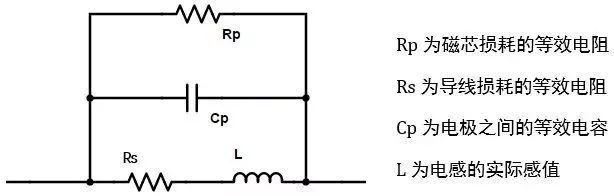 在電感器之等效電路中,常用一個(gè)并聯(lián)于電感的電阻來表示鐵損。當(dāng)頻率等于SRF時(shí),電感抗和電容抗抵消,等效電抗為零,此時(shí)電感器之阻抗即等效于此鐵損電阻串聯(lián)繞線電阻,且鐵損電阻已遠(yuǎn)大于繞線電阻,所以在SRF時(shí)的阻抗就約等于鐵損電阻。以一低壓電感為例,其鐵損電阻約在20kΩ左右,若以電感兩端的有效值電壓5V來估算,其鐵損約為1.25mW,這也說明了鐵損電阻愈大愈好。